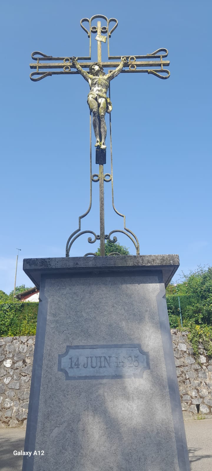 La croix a été élevée en 1925 à l’occasion de la béatification de Bernadette, qui eut lieu à Rome sous le pontificat de Pie XI. C’était une manière pour le petit village de l’honorer publiquement, comme un symbole de foi, de reconnaissance et de mémoire. L’initiative a probablement été soutenue par la communauté paroissiale ou par la commune elle-même, comme c’était courant à l’époque.