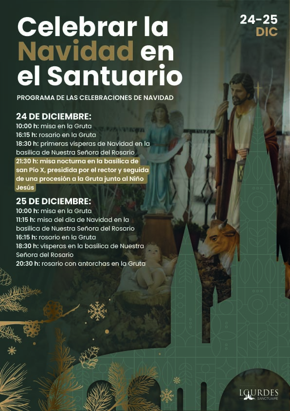 21:30 h: misa nocturna en la basílica de san Pío X, presidida por el padre Michel Daubanes, rector del Santuario, y seguida de una procesión a la Gruta junto al Niño Jesús.